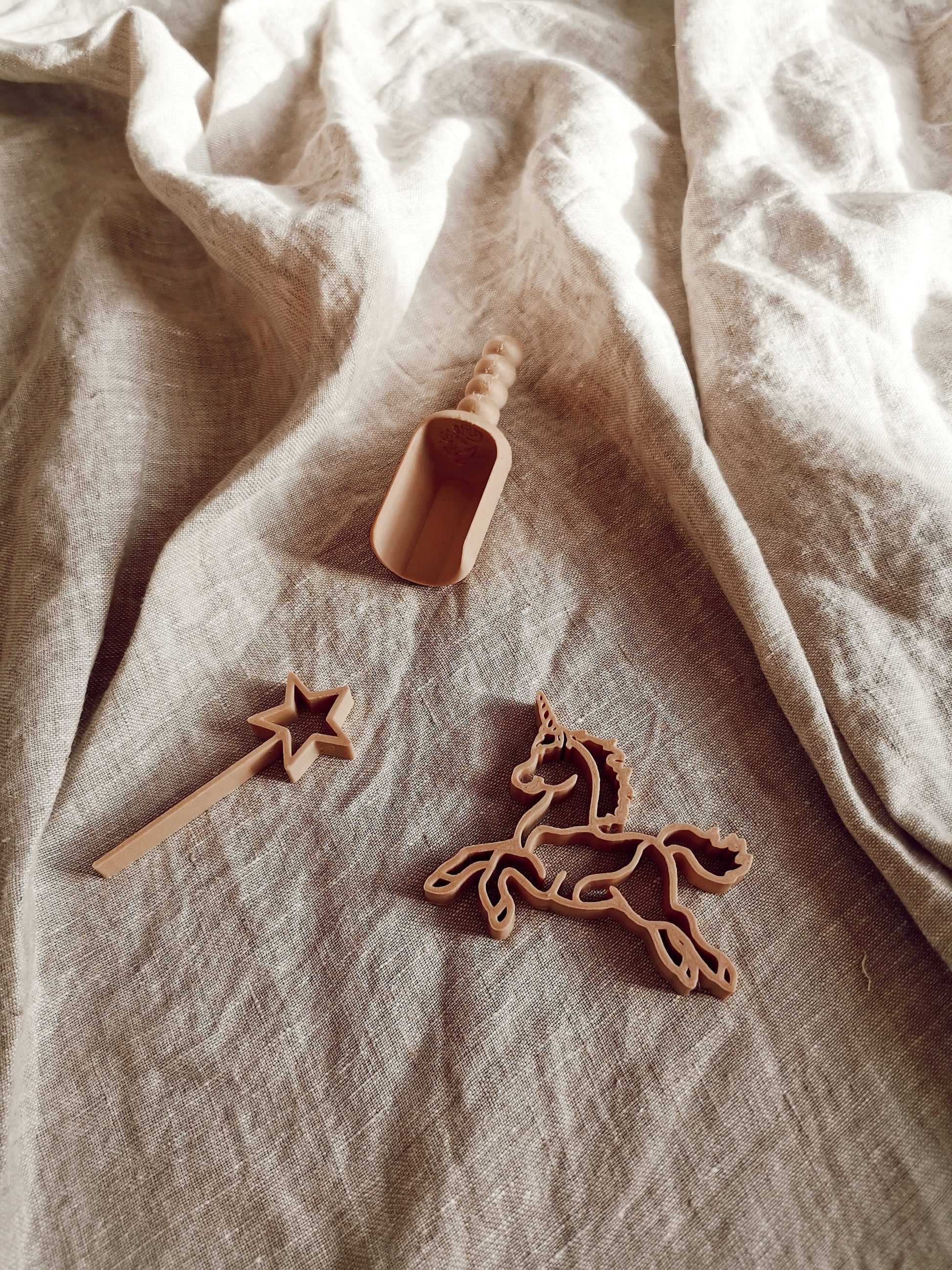 Een echte eenhoorn met een toverstaf als uitstekers van Grennn. Deze milieuvriendelijke uitstekers zijn gemaakt van gerecycled houtzaagsel en biologisch afbreekbaar plastic van plantaardige oorsprong. Deze twee uitstekers kunnen gebruikt worden in combinatie met speelzand. De stekers worden geleverd in combinatie met een linnen zakje.