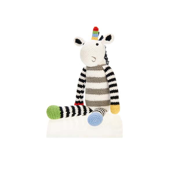 Een volledig met de hand gemaakte eenhoorn van het merk Pebble. Dit lieve vriendje is fijn zacht maar ook meteen een rammelaar Het is gemaakt van natuurlijke materialen en omdat het geheel handgemaakt is kunnen ze iets variëren van maat. Deze lieve eenhoorn wil graag vriendjes worden met jouw kindje.